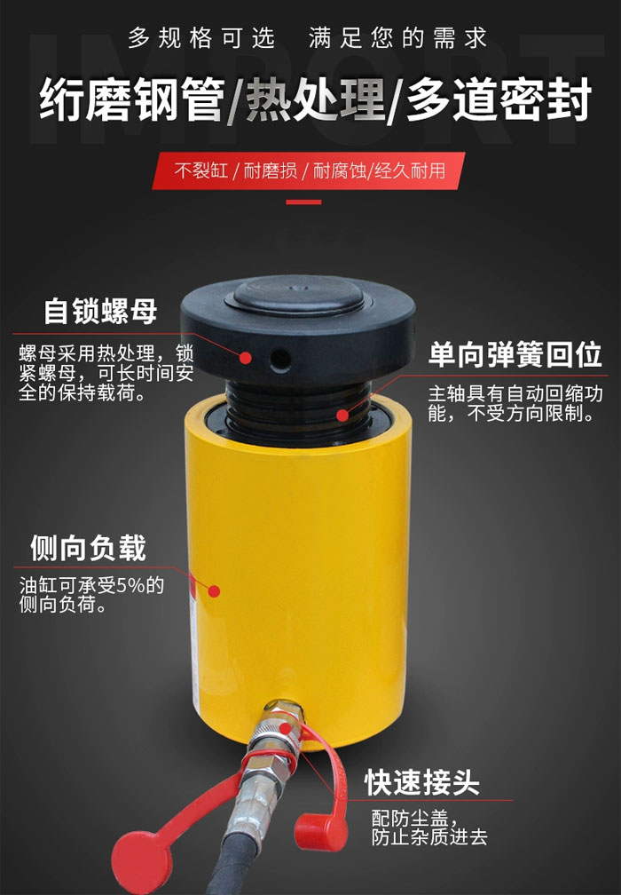 d)新的或久置的油壓千斤頂,因油缸內存有較多空氣,開(kāi)始使用時(shí),活塞桿可能出現微小的突跳現象,可將油壓千斤頂空載往復運動(dòng)2-3次,以排除腔內的空氣。長(cháng)期閑置的千斤頂,由于密封件長(cháng)期不工作而造成密封件的硬化,從而影響油壓千斤頂的使用壽命,所以油壓千斤頂在不用時(shí),每月要將油壓千斤頂空載往復運動(dòng)2-3次。